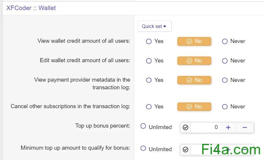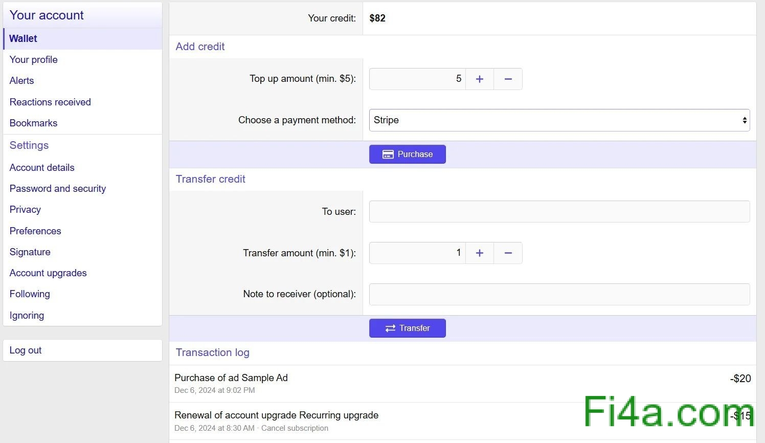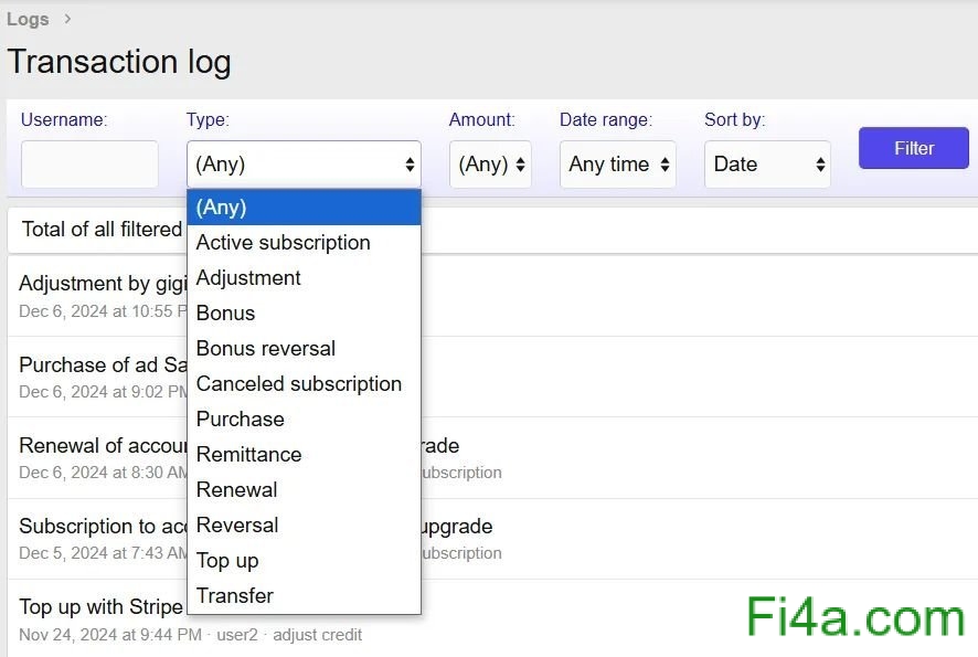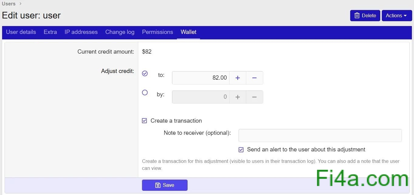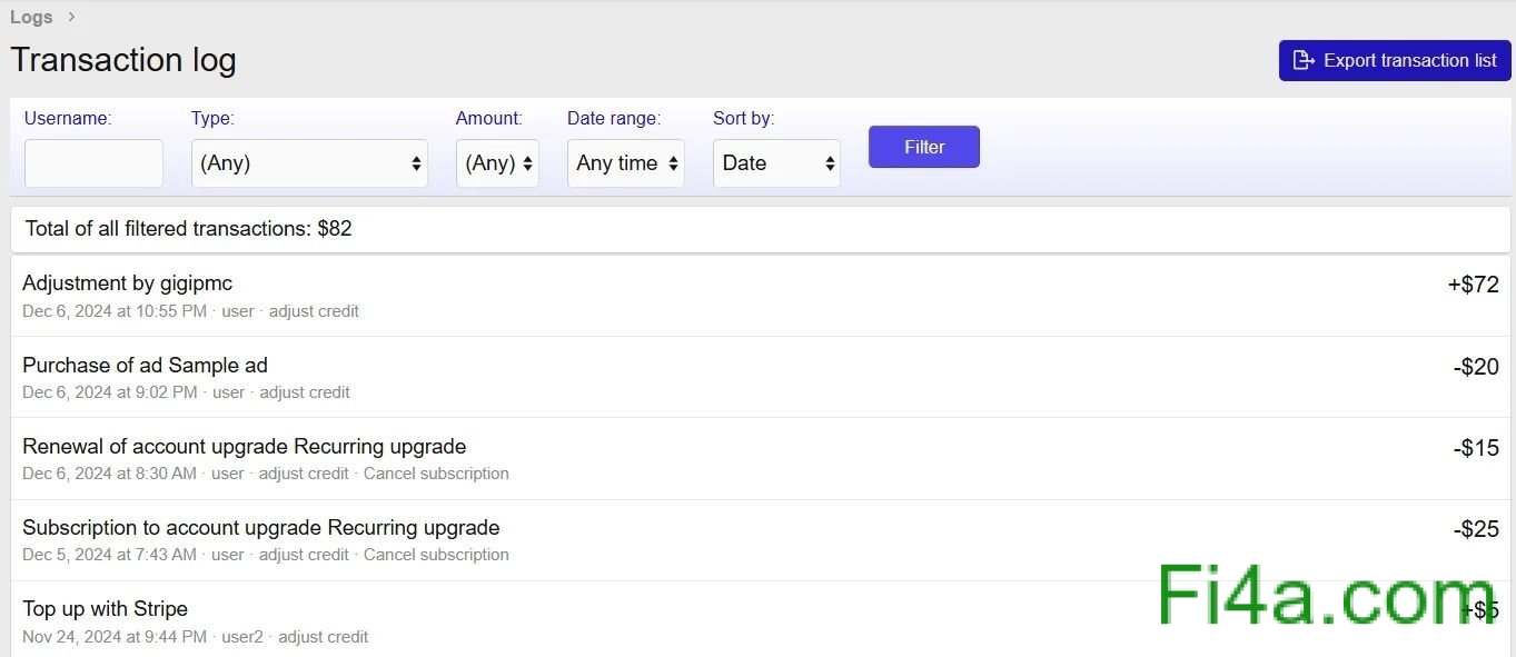 Поддерживает корректировки кредита (предназначено для администраторов и основано на разрешении). Корректировки регистрируются в журнале модератора. Также доступны пакетные корректировки кредита (например, «С Новым годом, бонус в размере 5 долларов для всех VIP-пользователей»).