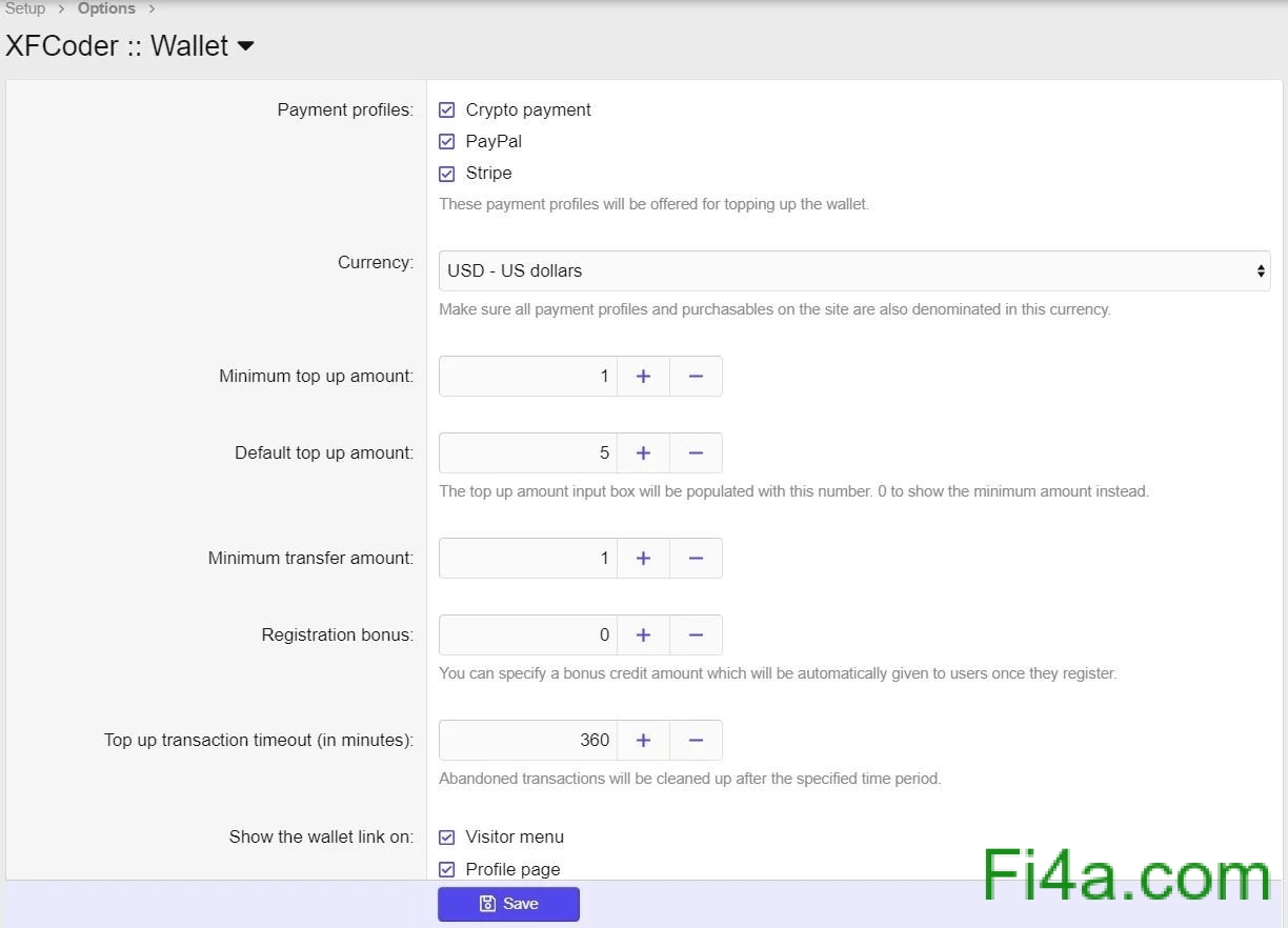 Поддерживает все валюты, предлагаемые XenForo. Пополнения криптовалютой поддерживаются, пока платежный шлюз возвращает эквивалент в фиате (что обычно и происходит).